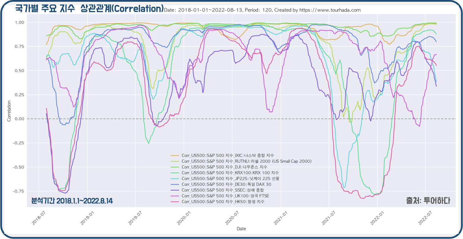 ▶️ 2018년 7월, 2019년 7월, 2020년 10월, 2021년 6월, 2021년 10월, 2022년 1월 경에 몇몇 지수들에서 음의 상관관계를 보였습니다.