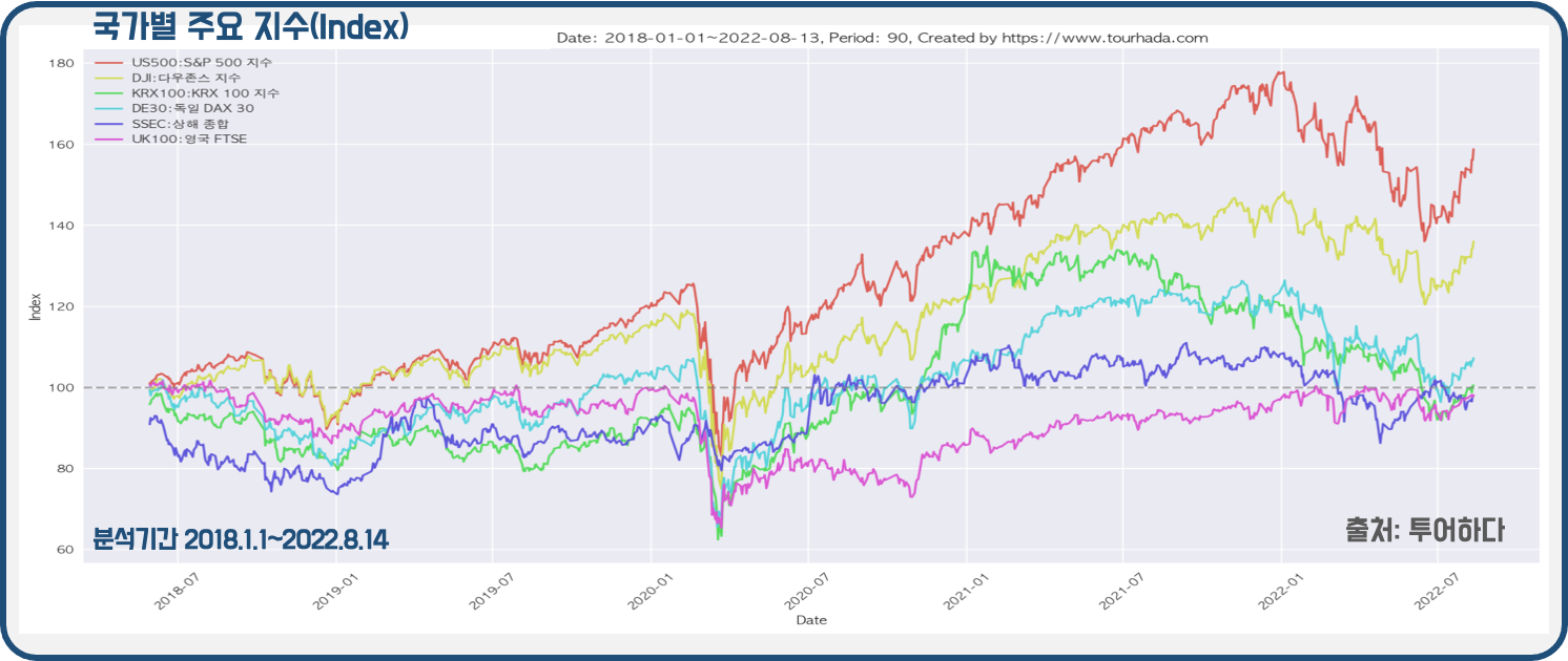 ✅ 비교대상: S&P500지수(미국), 다우존스지수(미국), KRX100(한국), DAX30(독일), 상해종합지수(중국), FTSE(영국)