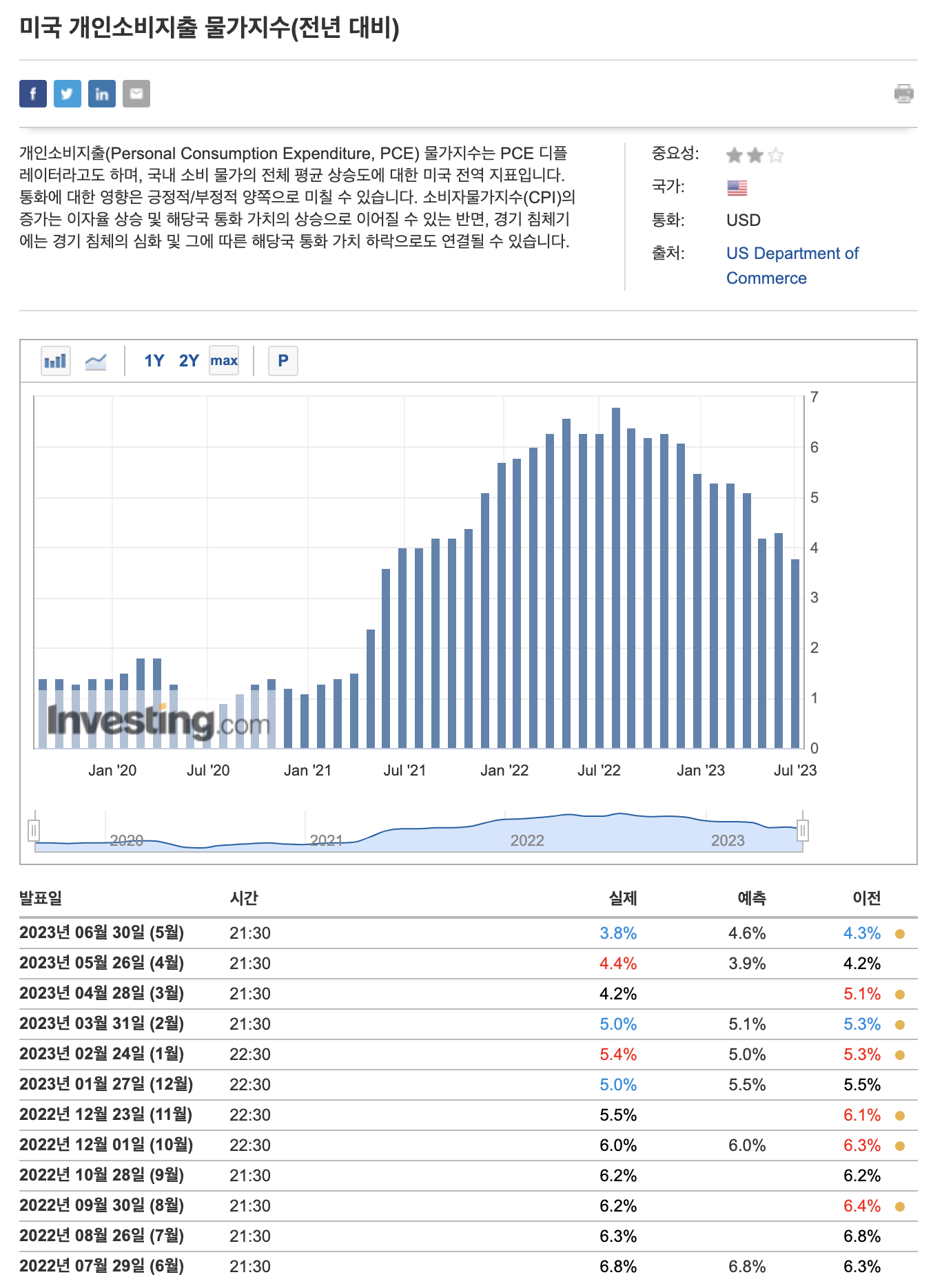- 미국 개인소비지출물가지수 PCE: 4.3% --> 3.8%(예측 4.6%)