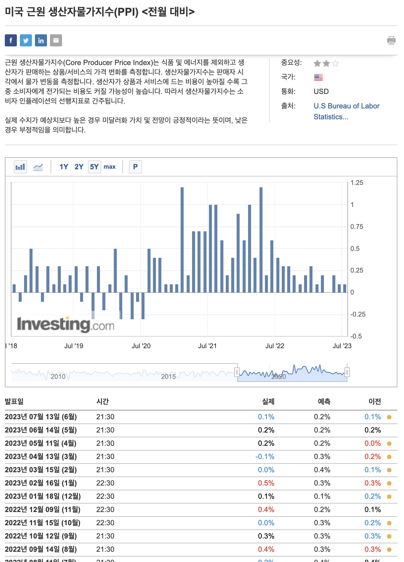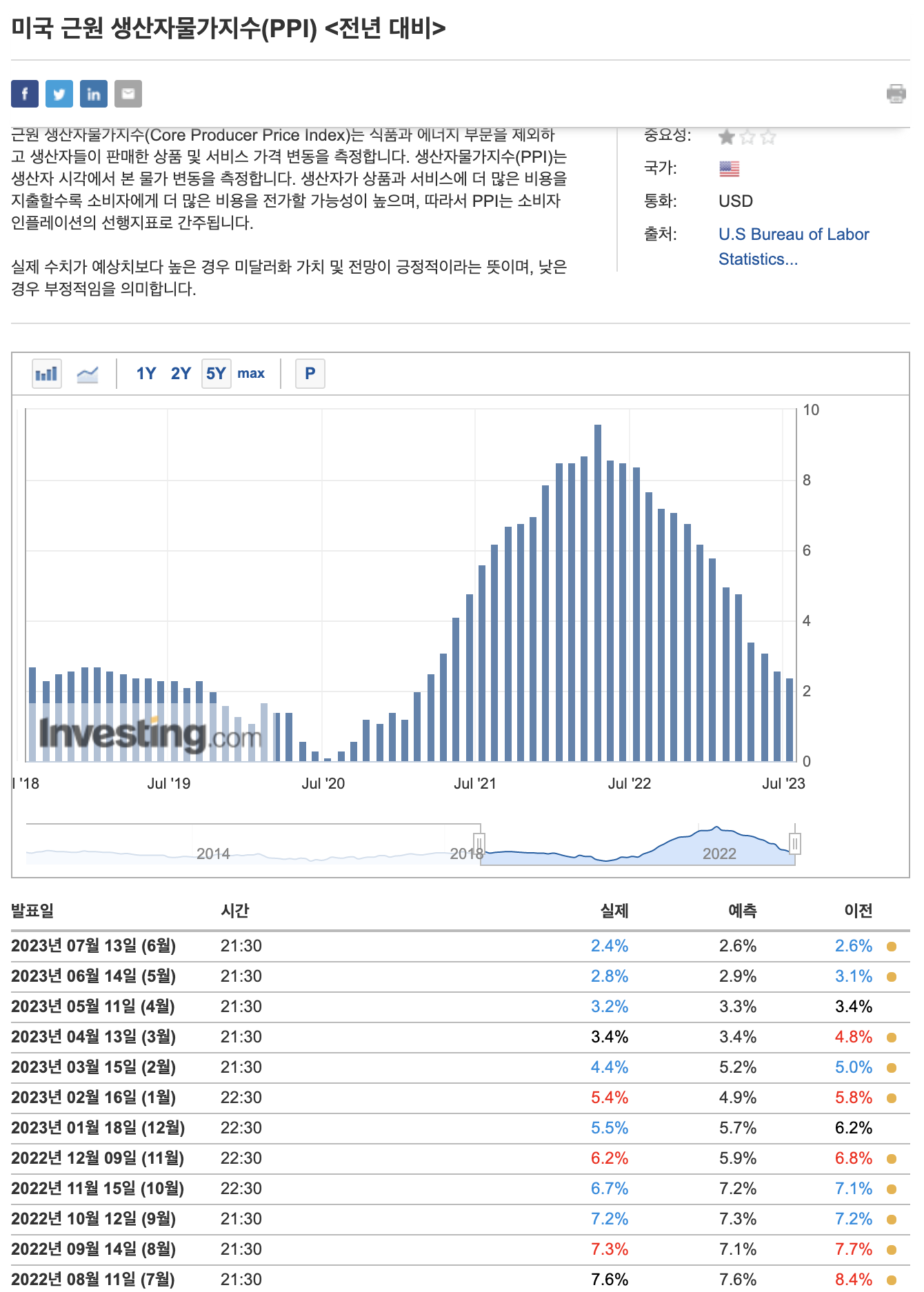 # 미국 생산자물가지수 PPI와 근원PPI (7월 13일 기준)