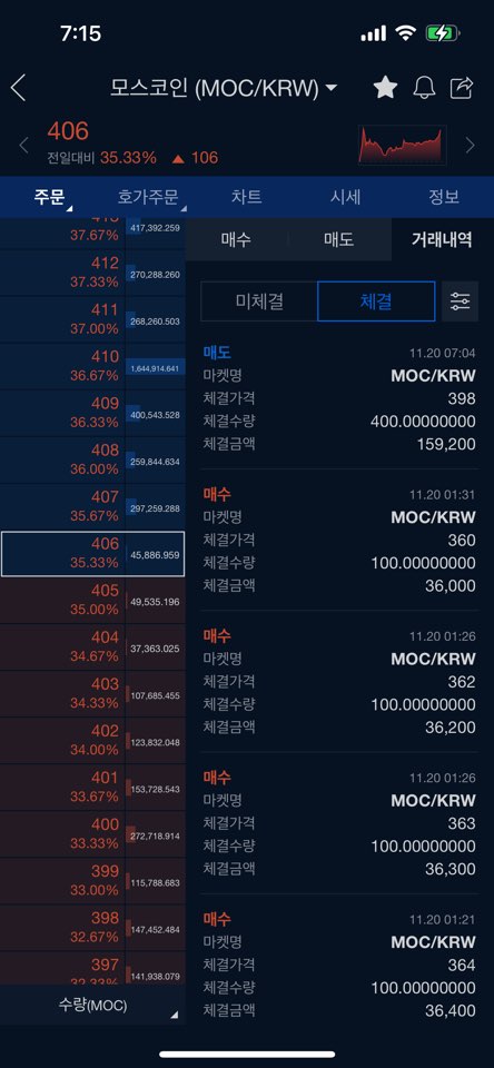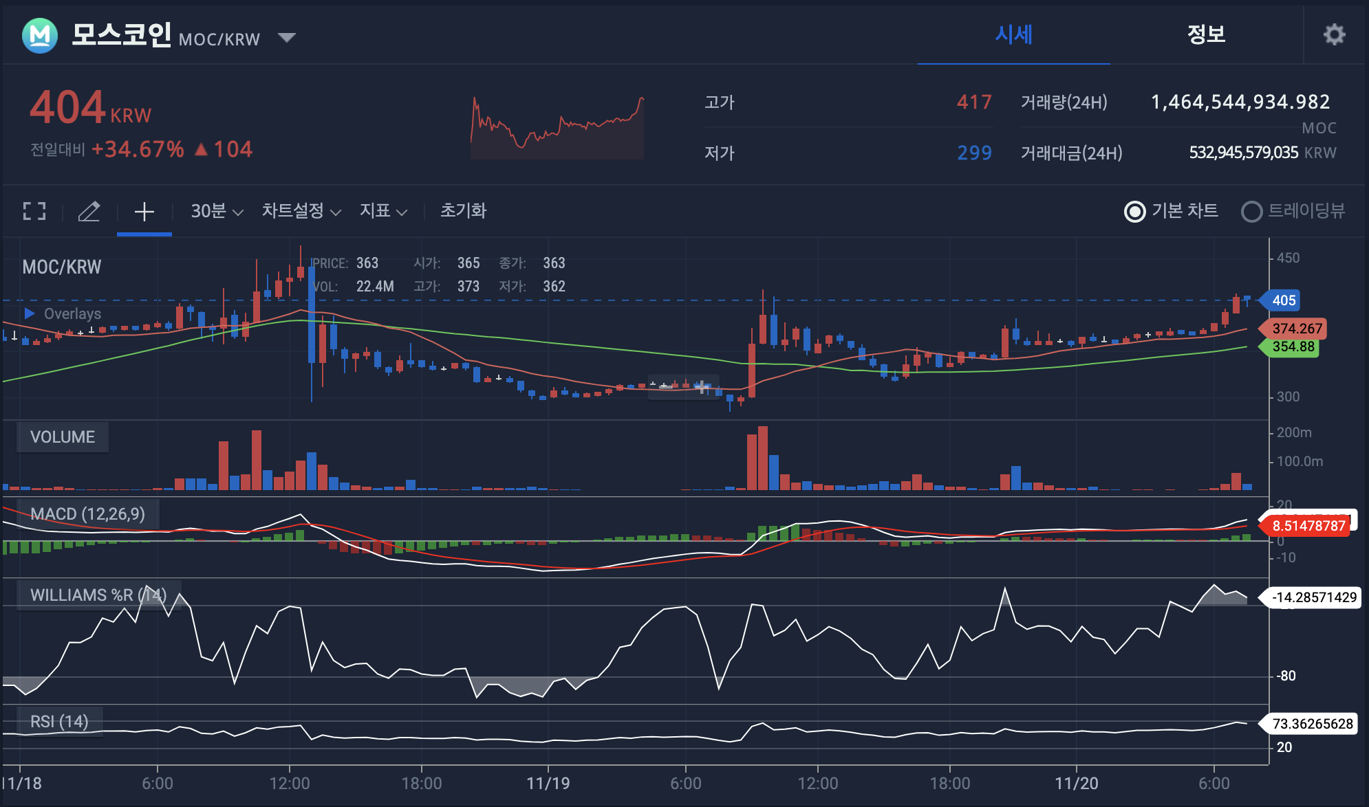 구체적인 시간대를 보면 11월 18일 13시경에 440원까지 올랐다가 다시 떨어지고, 11월 19일 09:30시 경에 389원까지 다시 올랐다가, 살짝 하락하면서 21시경에 386원 다시 매도 타이밍 왔다가 현재는 시가가 364원 근처에서 거래가 이루어 지고 있는 것을 알 수 있다.