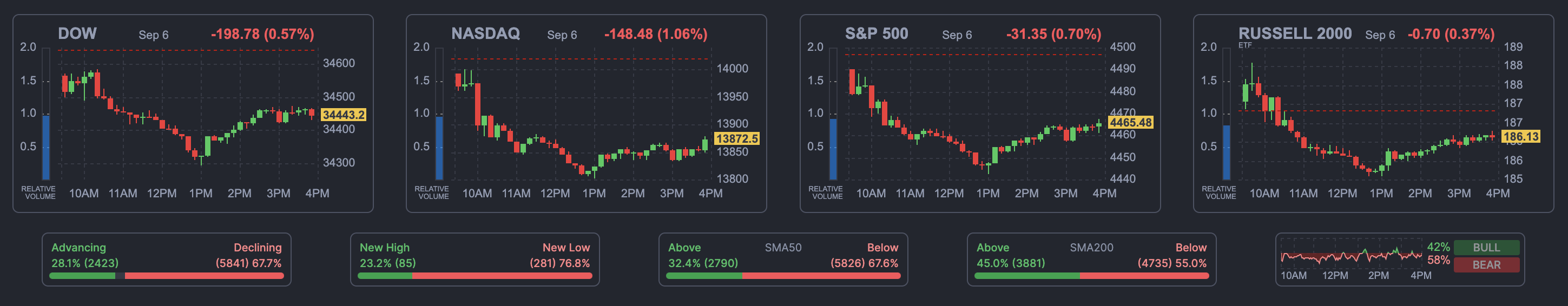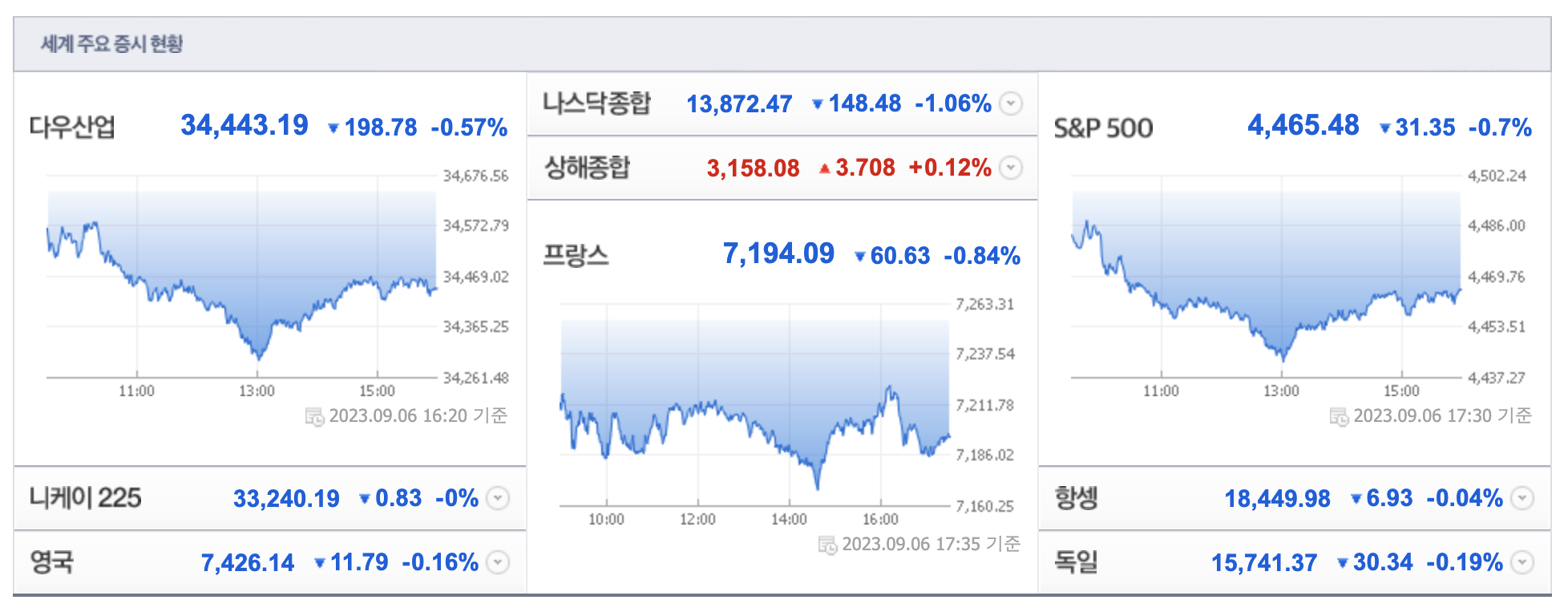 💠 뉴욕증시, 유가 상승에 연준 긴축 장기화 우려…다우 0.57%↓ 마감 [날짜: 20230907]
