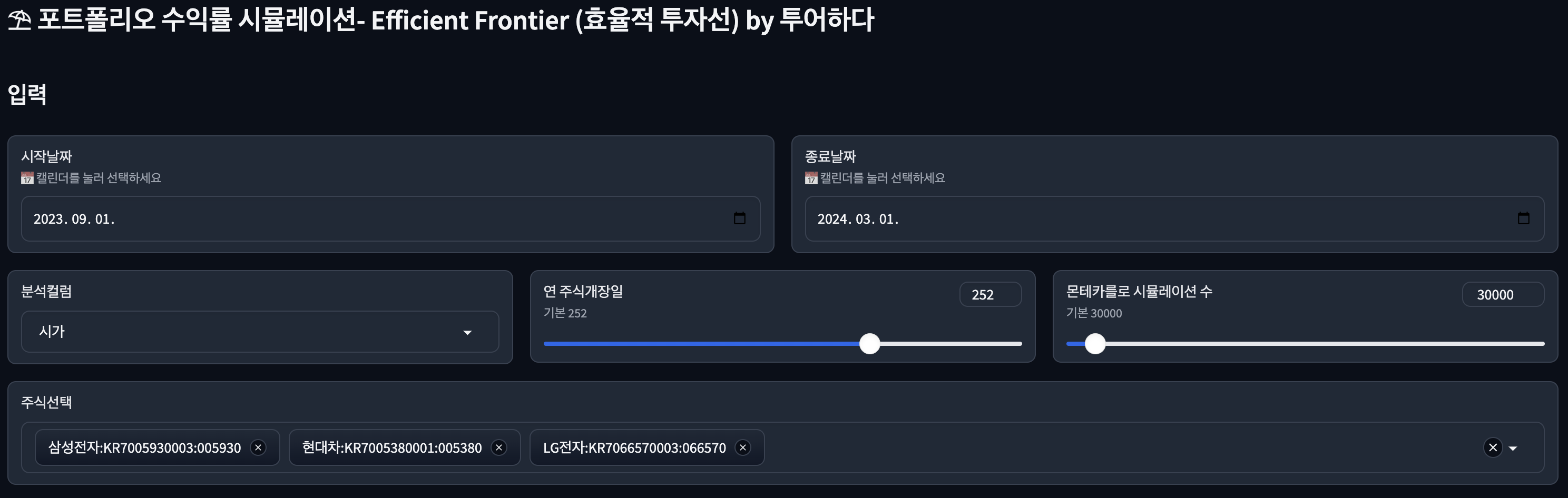 Efficient frontier (효율적 투자선)를 몬테카를로 시뮬레이션을 통해 쉽고 간단하게 사용해볼 수있도록 테스트 해볼 수 있는 프로그램 열어두었습니다. (업데이트 오늘간만 오픈)