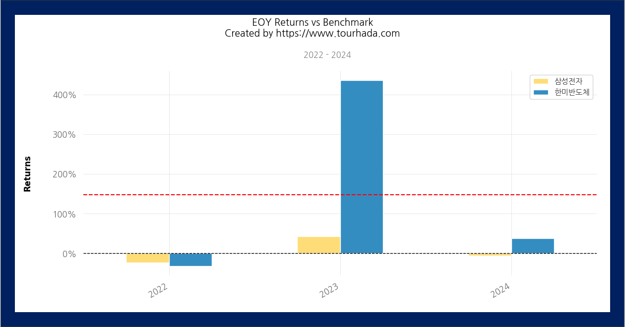 본 그래프는 한미반도체와 삼성전자(Benchmark)의 누적 수익률을 비교 분석한 것으로, 이는 투자자들에게 각 지역의 반도체 산업 내 기업들의 장기적 성과를 이해하는데 도움을 줍니다. 분석 기간 동안 한미반도체 기업의 주식은 탁월한 누적 수익률을 보여주었습니다. 특히 마지막 분기에 주가가 급등함으로써 투자자들에게 매우 유리한 시장 상황을 제공했습니다. 이는 기술 혁신이나 중요한 경영 결정, 혹은 시장 점유율의 확대와 같은 긍정적인 요인에 기인할 수 있습니다.