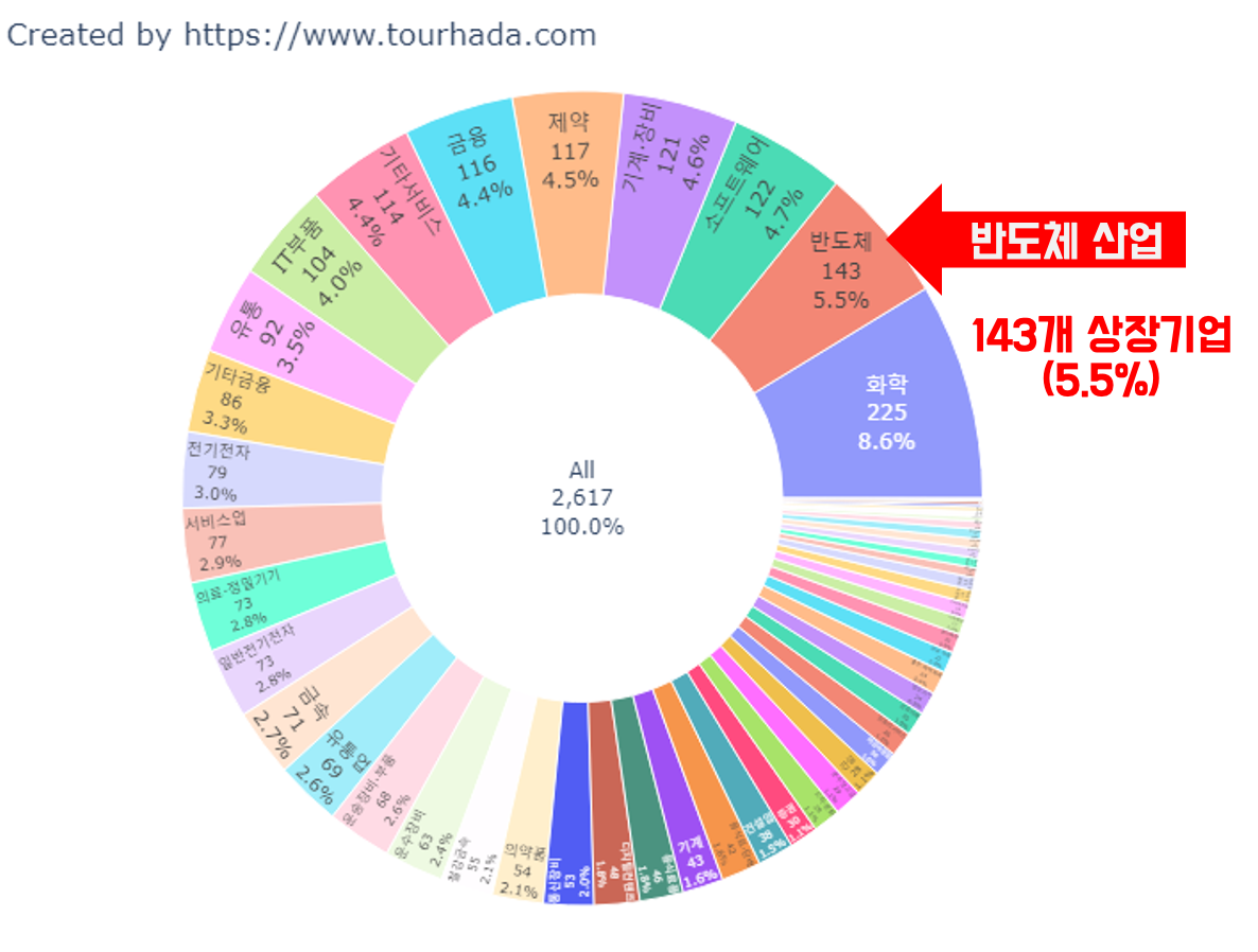국내 상장된 기업(총 2,617개) 산업 시가총액 순위를 섹터별로 나열한 것입니다. 이 중 시가총액이 높은 삼성전자와 SK하이닉스는 전기.전자 산업군으로 분류가 되어있습니다. 이들 중 반도체 산업 분류된 기업은 143개 기업이 있고, 전체 상장된 기업 들 중에 5.5%에 해당합니다.