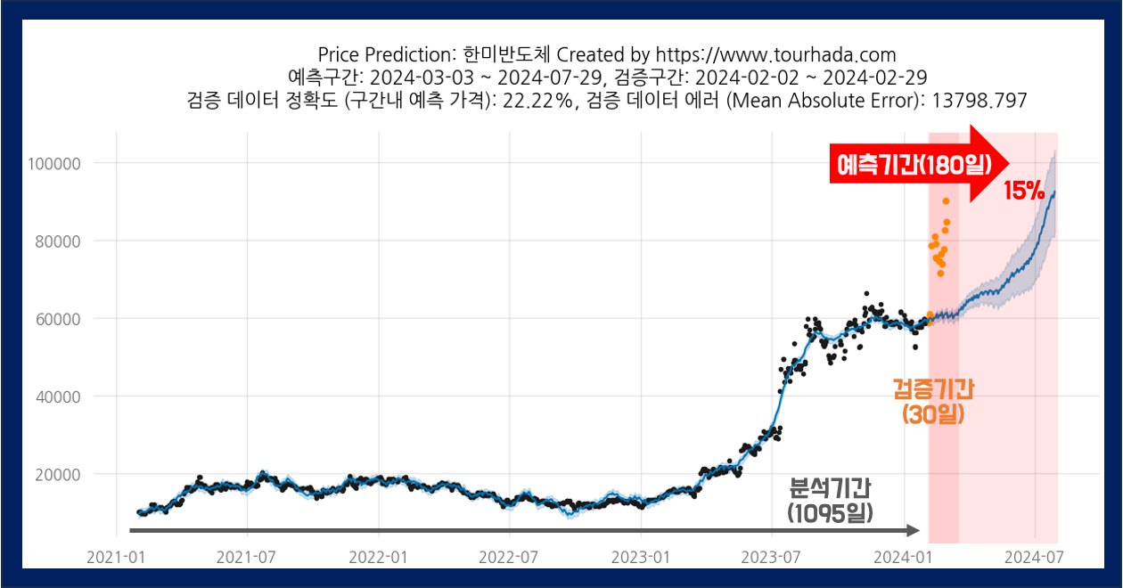 한미반도체 기업의 주가는 눈에 띄는 상승세를 보이고 있으나, 예측 모델의 높은 오차와 예측 구간의 넓은 범위는 투자 결정에 있어 신중한 접근을 요구합니다. 모델의 예측력 강화와 추가적인 시장 분석이 필요하며, 투자자는 시장 동향을 면밀히 모니터링하며 유연한 투자 전략을 유지해야 할 것입니다.