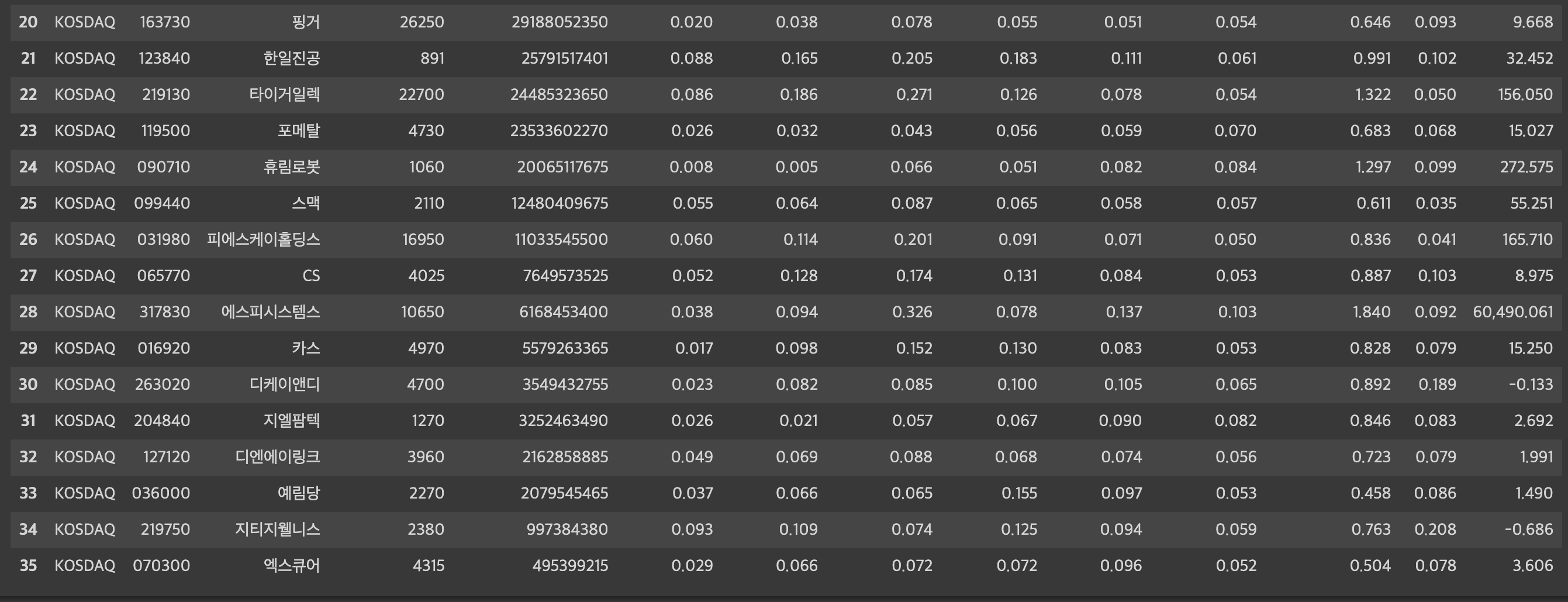 | KOSDAQ | 031980 | 피에스케이홀딩스 | 16950 | 11033545500 | 0.060 | 0.114 | 0.201 | 0.091 | 0.071 | 0.050 | 0.836 | 0.041 | 165.710 |